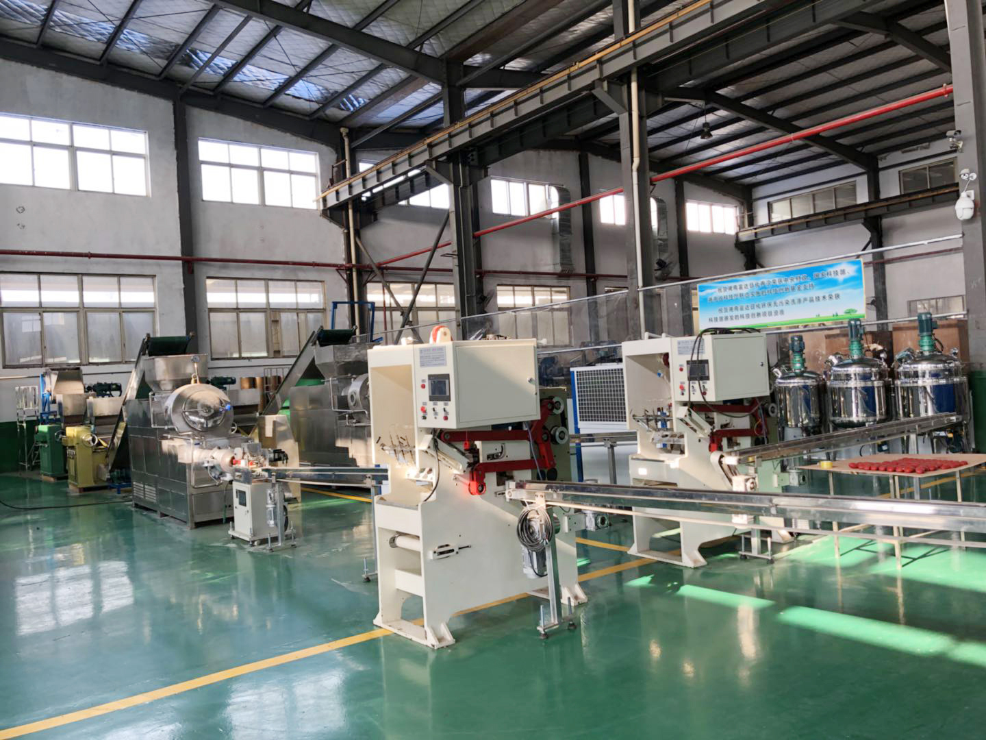 本套生產線為從油脂溶化,油脂皂化、鹽洗、堿洗、漂色、整理、真空造粒、一次研磨、連續真空雙筒雙聯出條、切塊成型(目前國內外最先進工藝)。具有占地少,消耗低、用人少,產品質量穩定等特點,并能生產脂肪酸含量從38%—70%的多種肥皂產品(高、中、低檔各類產品)。